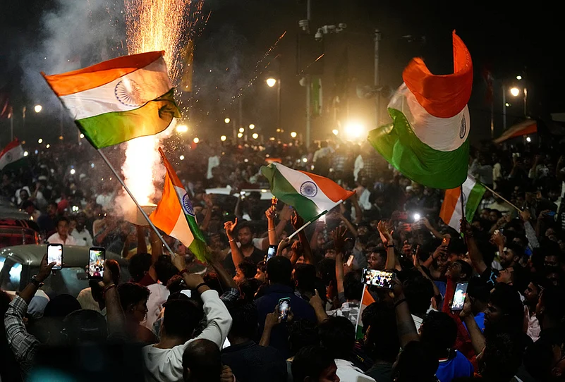जश्न के दौरान कई जगहों पर लोगों ने तिरंगे के साथ रैली निकाली और टीम इंडिया के समर्थन में नारे लगाए।